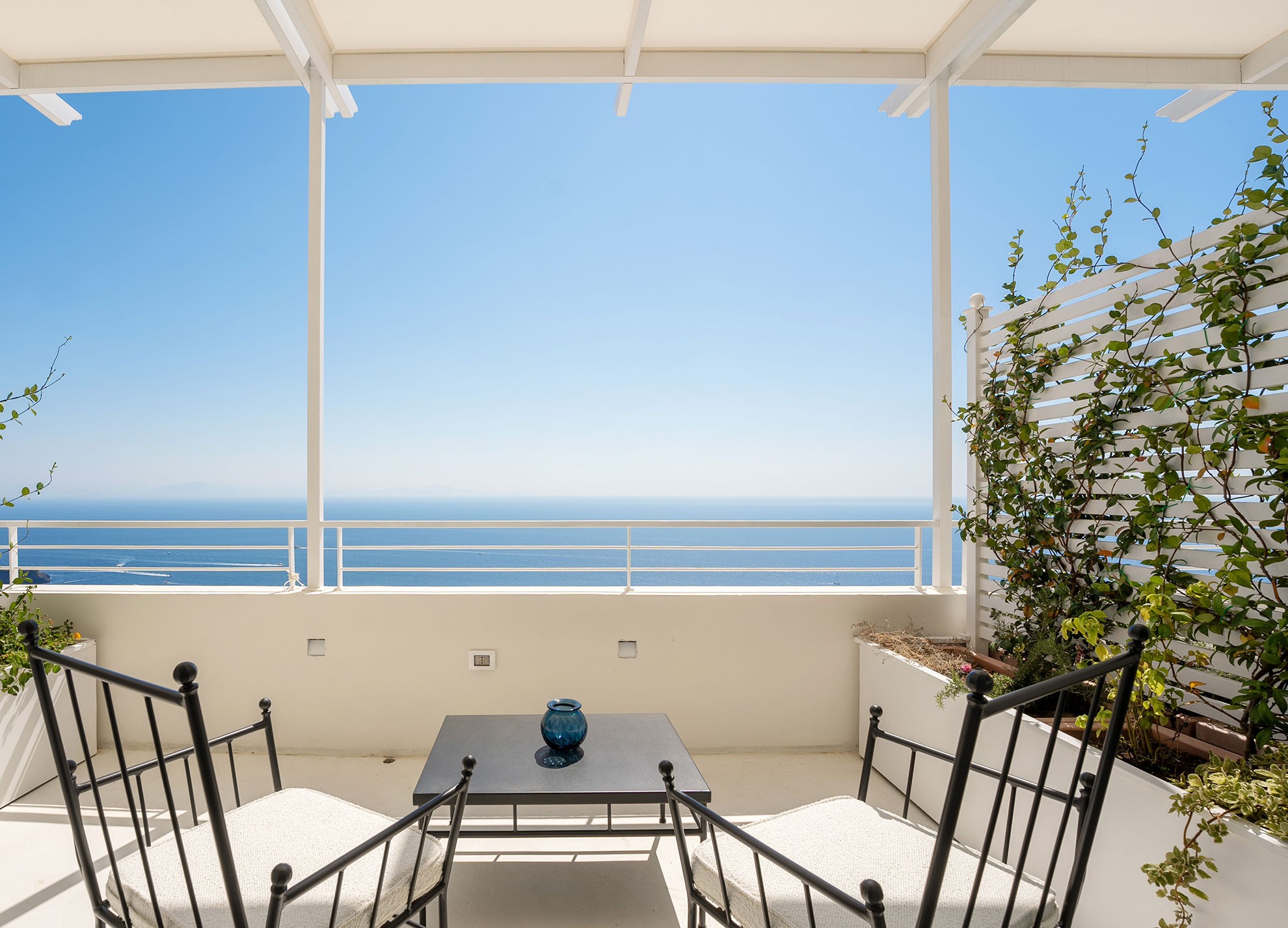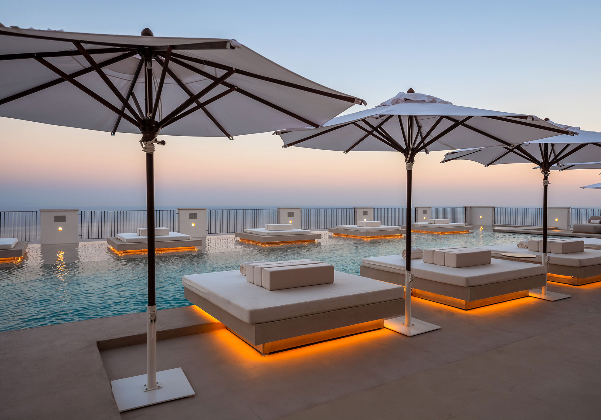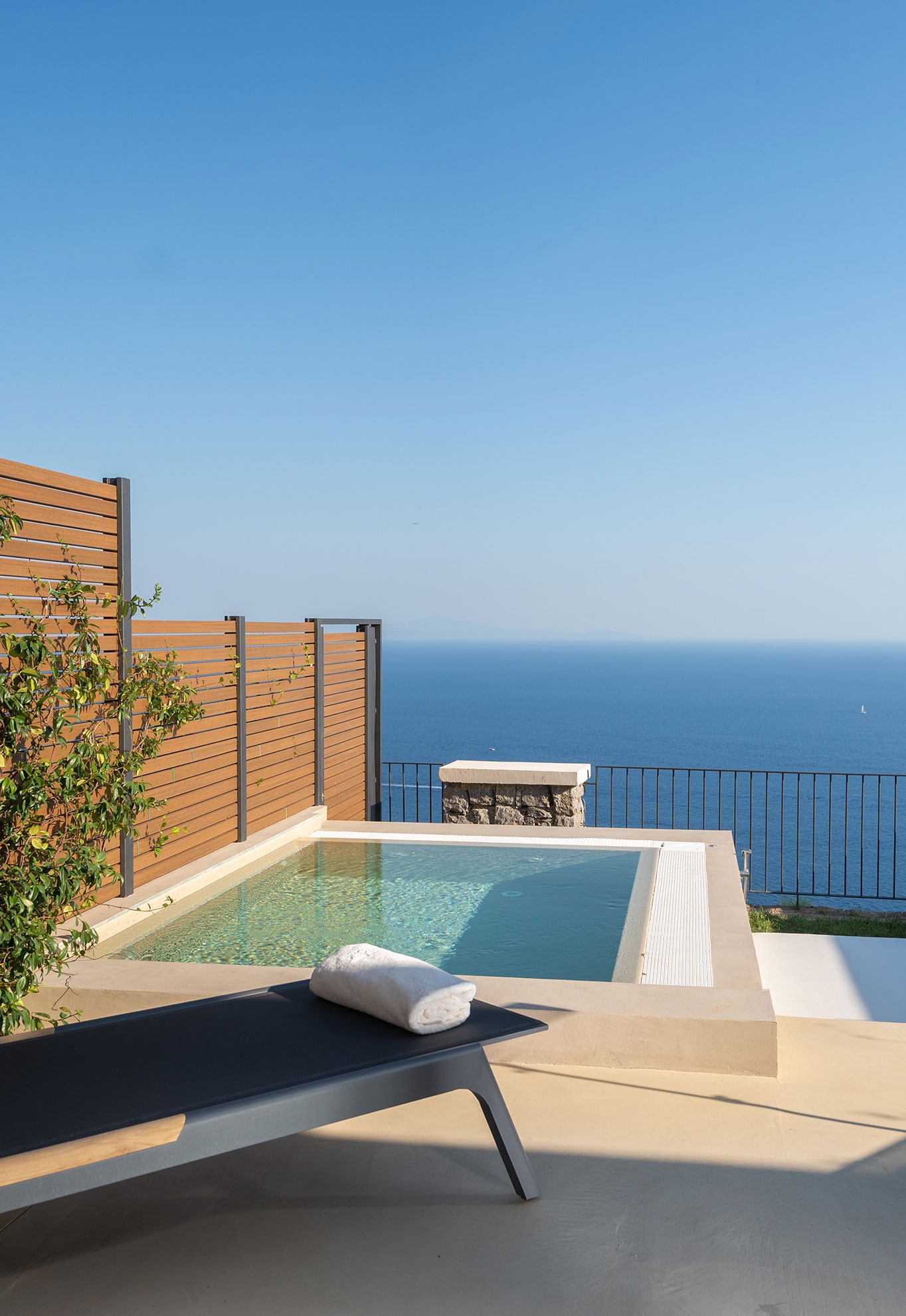 Set on one of the coast’s most exclusive terraces, the hotel offers 35 elegant sea-view rooms and suites with contemporary Mediterranean design. A true destination, it features five signature F&B outlets — including a Michelin-starred restaurant — along with panoramic spaces dedicated to wellness and relaxation. Every detail reflects the essence of the Mediterranean soul. The 2,000 sqm sanctuary includes 500 sqm indoors, with a heated pool with hydromassage, sauna, hammam, cold plunge, single and couple treatment rooms, an Herbarium, and a relaxation area;and 1,500 sqm outdoors, featuring a heated saltwater infinity pool, solarium, Kneipp path, heated pools, and dedicated areas for yoga, pilates, meditation and massages.