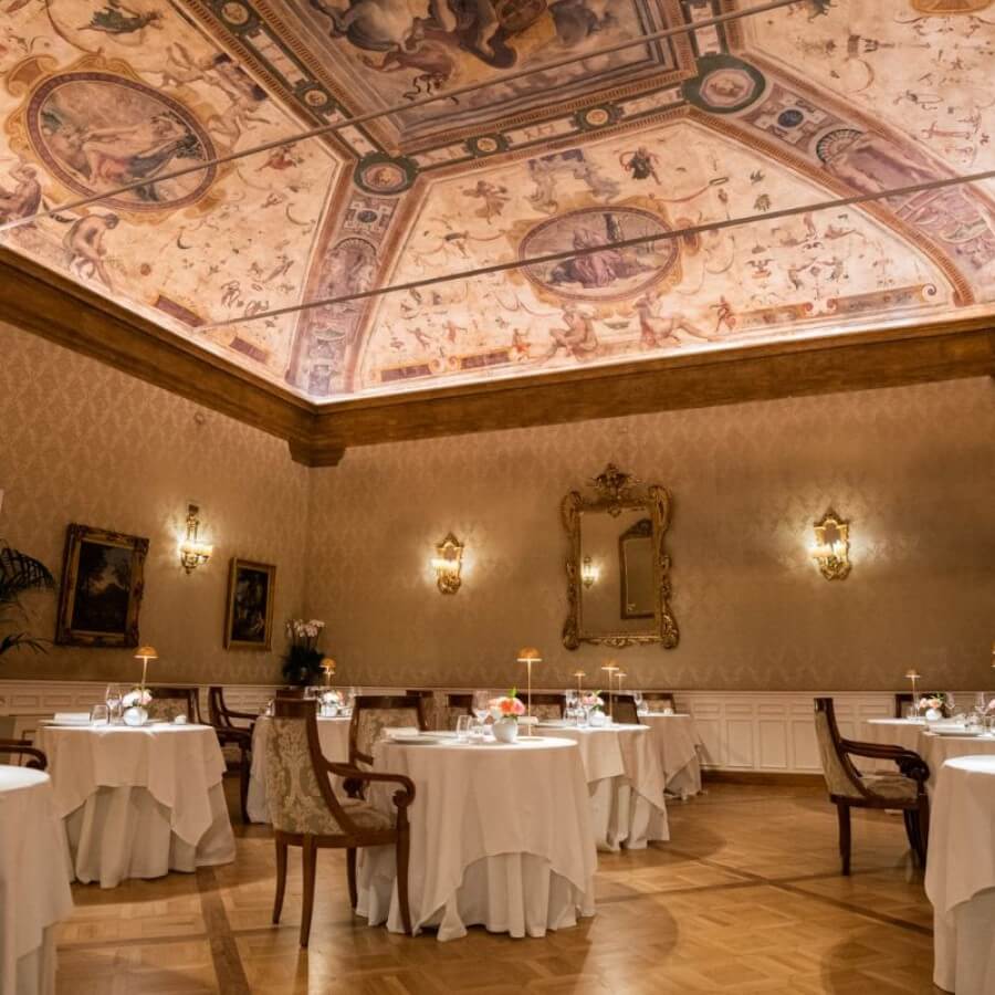 The hotel is famous for its I Carracci Restaurant with its frescoes, which is rightly regarded as among the most sophisticated and elegant in Bologna. This is a place where you may enjoy the traditional recipes of the Emilia region whilst seated under authentic Italian masterpieces. Our new “Enoteca Morandi” with a well-stocked cellar provides a wide range of fine Italian and foreign wines to complement a traditional and “rustico” regional menu. I Carracci Restaurant has recently been rewarded with the prestigious Three Forks Micheline and included in the last Espresso Italian Restaurants Guide.